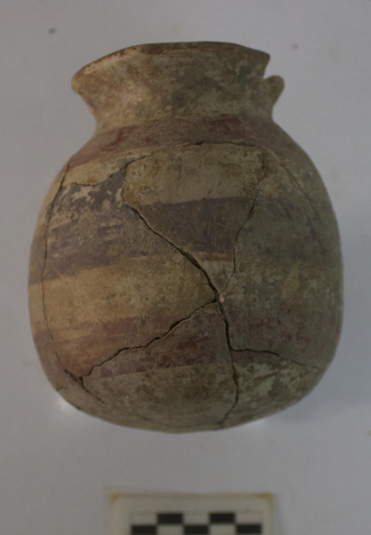 376 - Jarra polícroma carenada con hombros alzados y cuello largo. Engobe blanco y decoración de bandas de color alternas rojas y moradas.