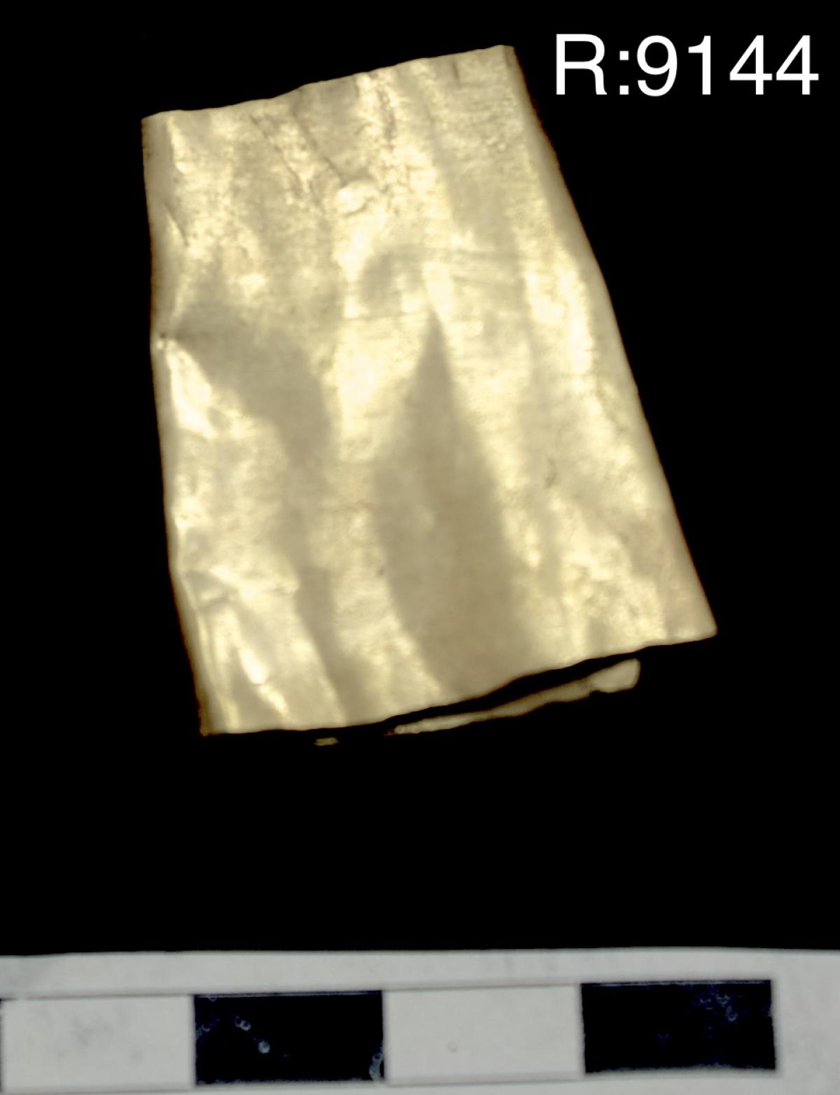 Pequeño brazalete de oro perteneciente al ajuar del individuo I20 de la tumba T2. Lleva cuatro orificios para introducir los elementos de atado.