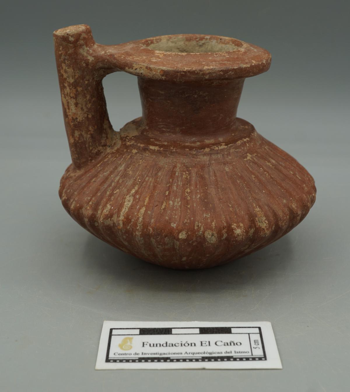 Jarra carenada de pequeñas dimensiones. Tiene la base anular, cuerpo carenado y estriado, hombro alzado y anguloso, cuello largo y borde desplazado lateralmente. Un asa vertedera une el borde y el cuerpo de la vasija. Engobe de color rojo en el exterior.